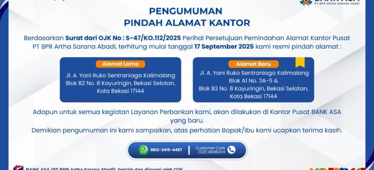 • Pengumuman Resmi: Pindah Alamat Kantor Pusat BANK ASA Mulai 17 September 2025