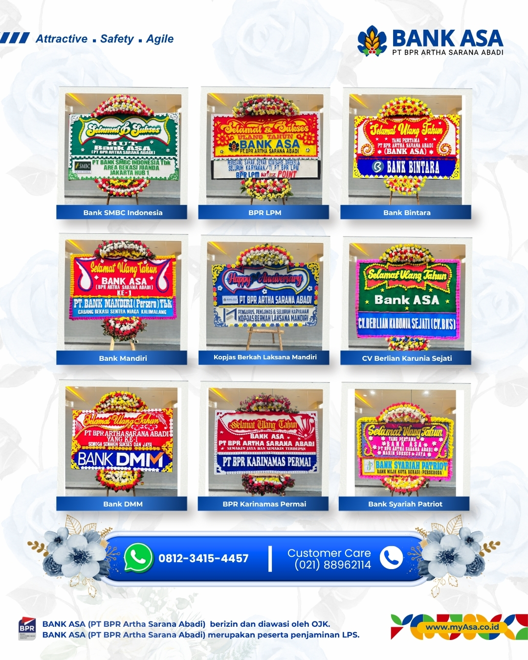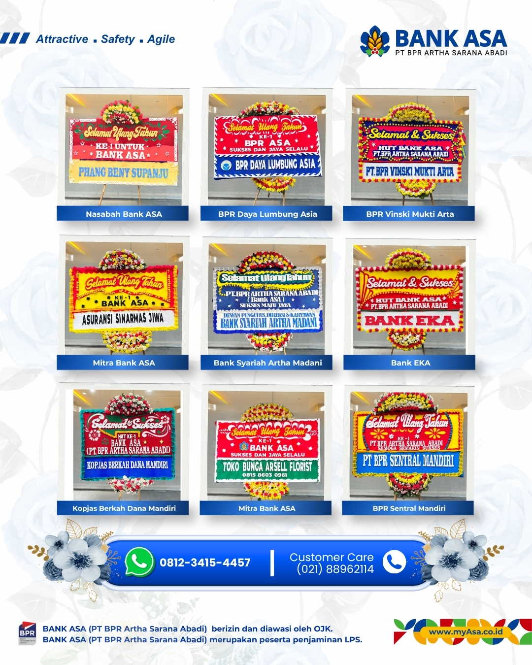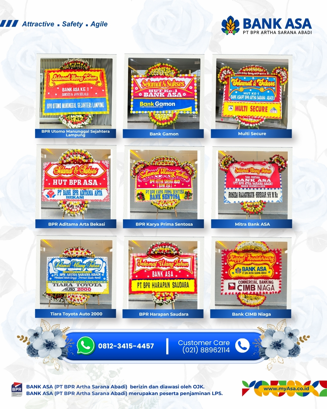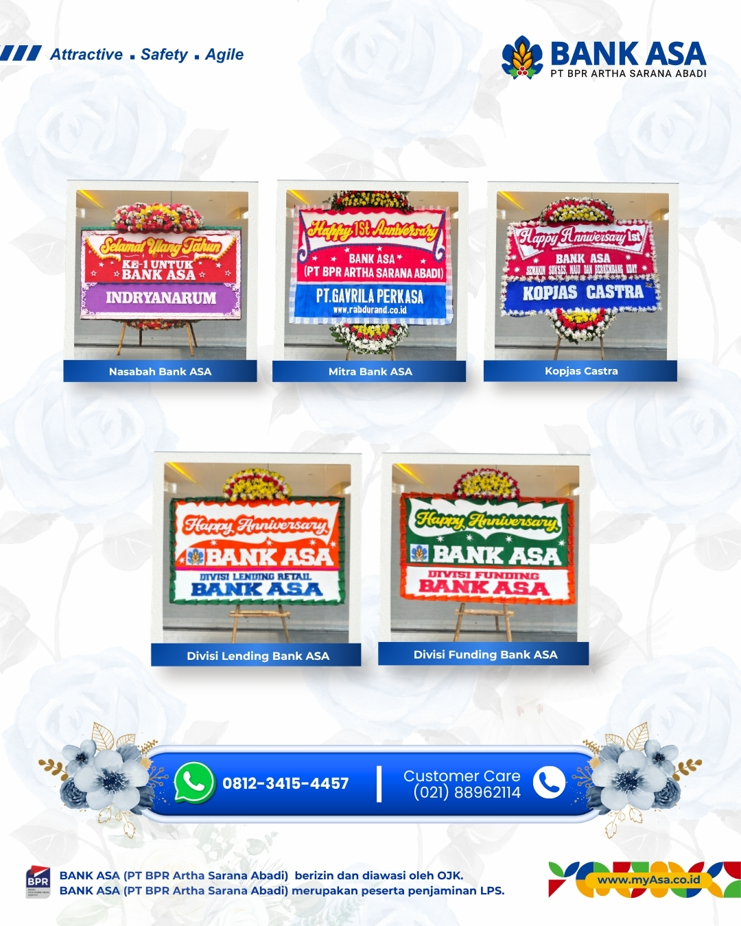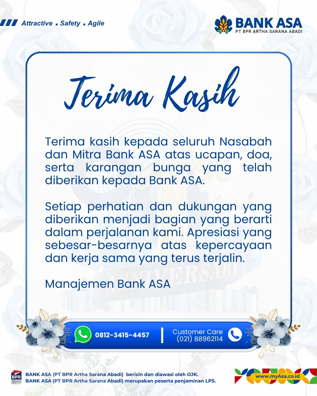 Manajemen dan seluruh karyawan Bank ASA menyampaikan apresiasi yang sebesar-besarnya atas dukungan dari para mitra dan nasabah. Setiap bentuk partisipasi, baik berupa ucapan, doa, maupun karangan bunga, memiliki makna yang sangat berharga dan menjadi penyemangat bagi kami untuk terus berkembang.